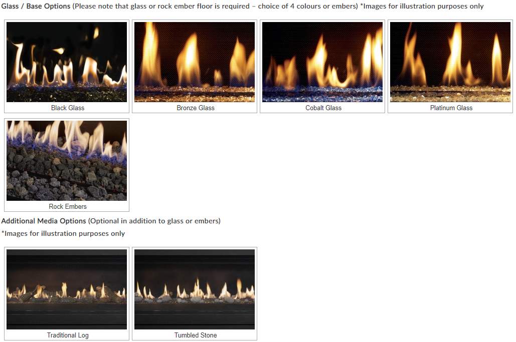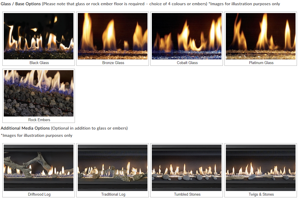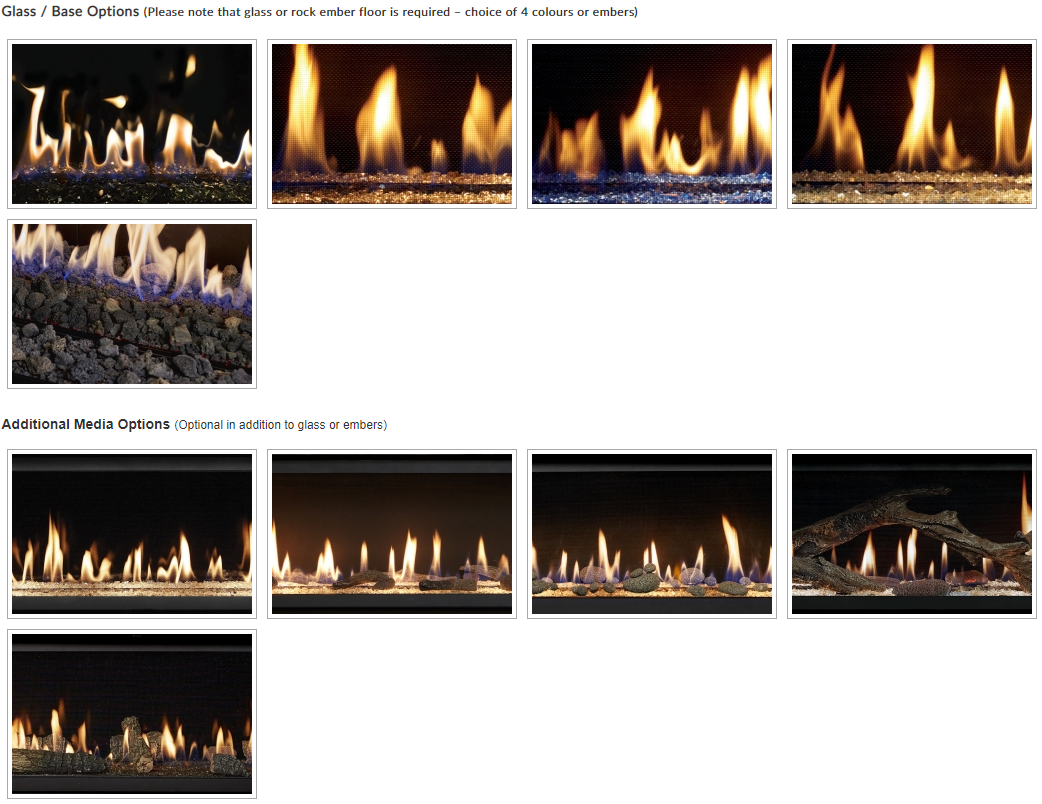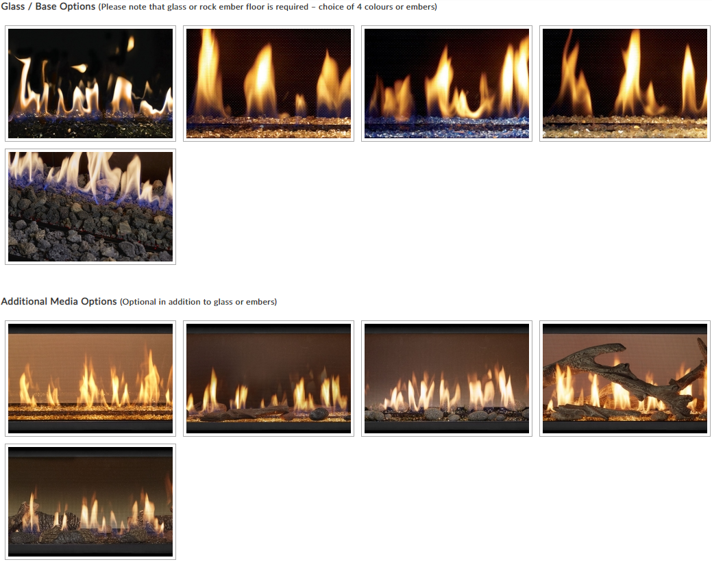 Like the full Lopi linear range you have the option of just a glass bed in a choice of 4 colours or rock embers. As an option, you can add one the additional media option s including a contemporary Driftwood, Traditional Log, Tumbled Stoned or Driftwood Twig & Stones.