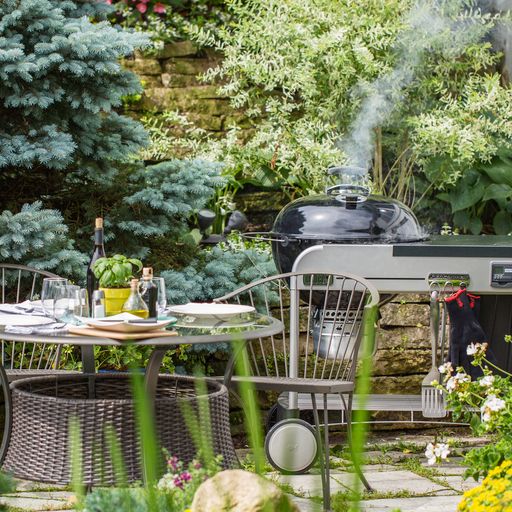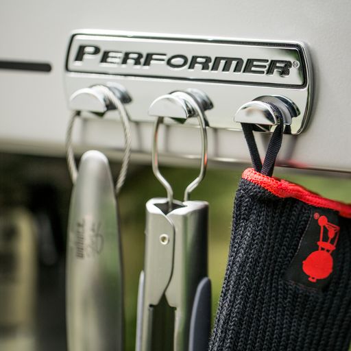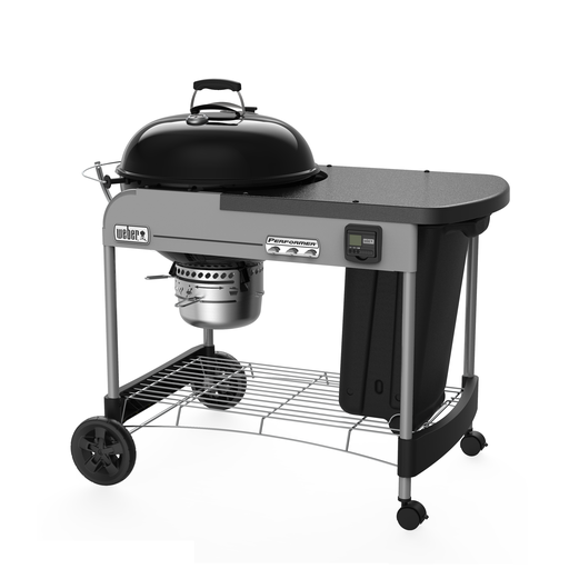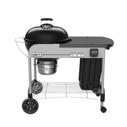 The ultimate Weber kettle is the Performer Premium. The convenient work surface is made of painted metal and underneath is a pull out storage bin for items such as additional charcoal or smoking woods. The Performer Premium also features a Tuck-Away lid holder that allows the lid to slide back and out of the way when accessing your food. And, with the removable digital cooking timer, you can take the guesswork out of timing those magnificent Weber roasts to perfection. The Performer Premium also features a stainless-steel Weber Gourmet Barbecue System cooking grill, P-vents, ash catcher ring with smoke setting indicator, and black lid handle and wheels.