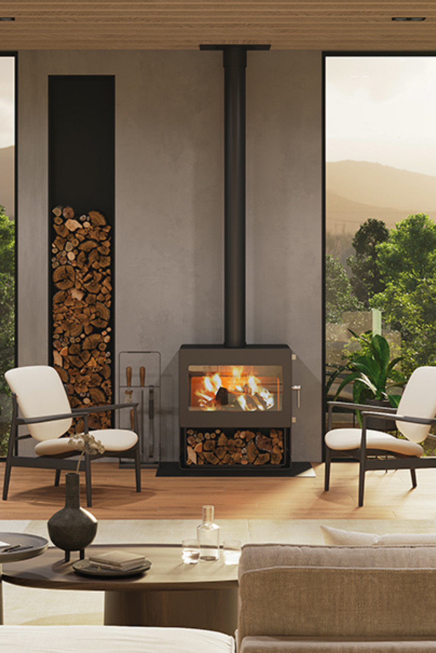 The B700 landscape model is a new addition to the Blaze wood heating range with modern design that incorporate convenient wood storage, as well as powerful heat output which is further enhanced by a 3-speed remote control fan.