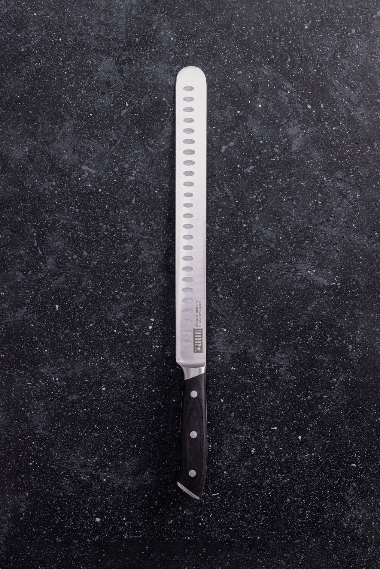 The hollow-edge design on this slicing knife runs the full length of the blade, reducing friction and delivering a smooth, easy and comfortable slicing experience. The razor-sharp cutting edge makes short work of the largest brisket, through to a thinly sliced segment of sashimi.