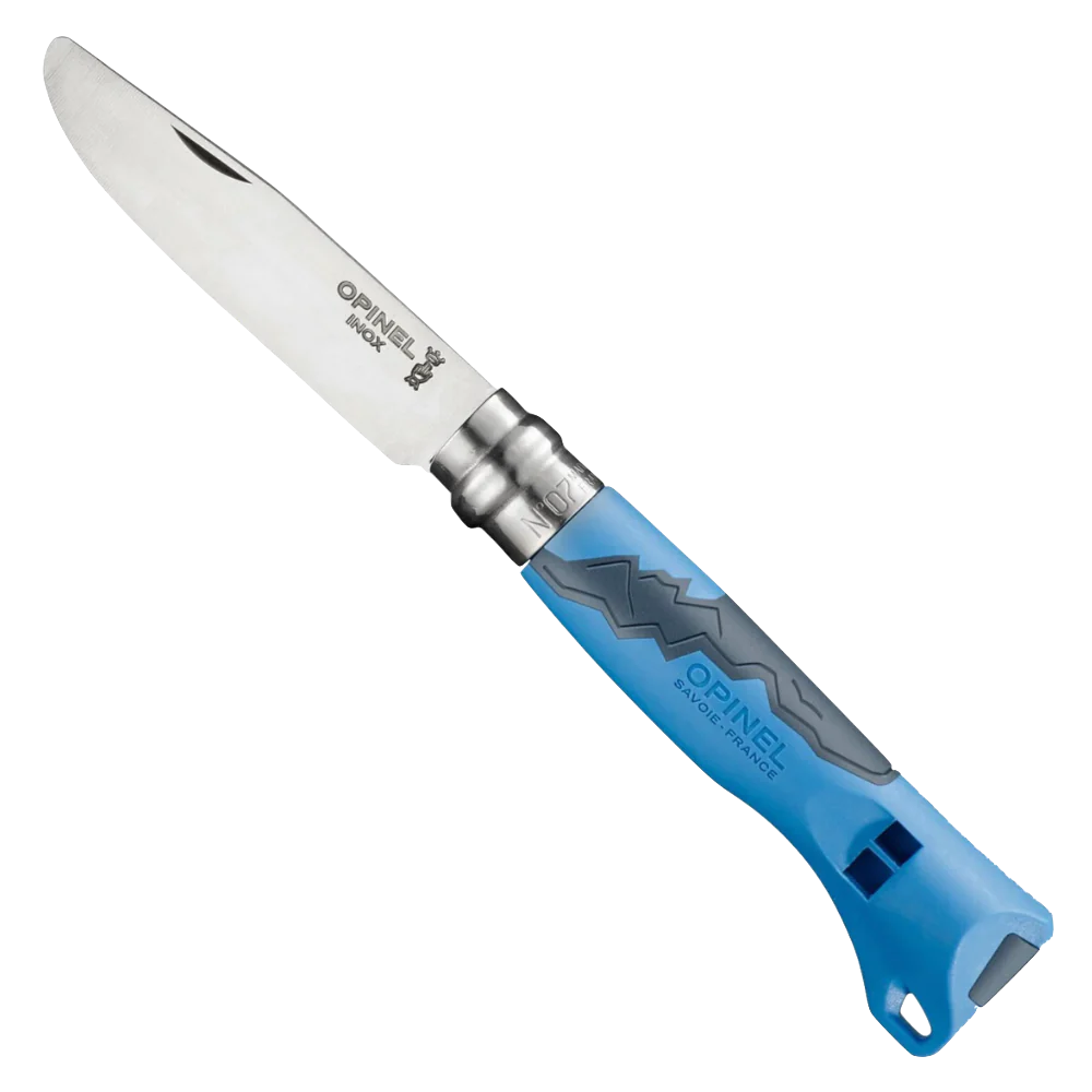 The Opinel N°07 Outdoor Junior is an ideal folding pocket knife for scouts, young adventurers, and campers. Designed with safety in mind, it features a blunted tip to enhance protection for young users. The knife is equipped with a pea-less safety whistle that functions effectively in various conditions, including cold, hot, and wet environments. While this knife is perfect for outdoor excursions, it is essential that it is used under adult supervision. The sharp stainless steel blade, with its rounded tip, ensures a safer experience for children. Additionally, the patented locking mechanism guarantees that the blade remains securely opened or closed during use.