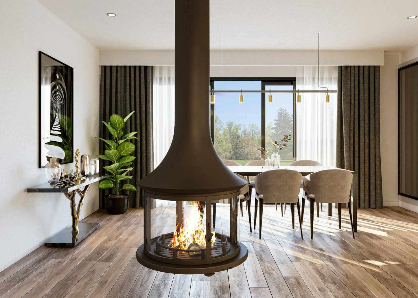 JC Bordelet LEA998 Central hanging fireplace with fire safety glass