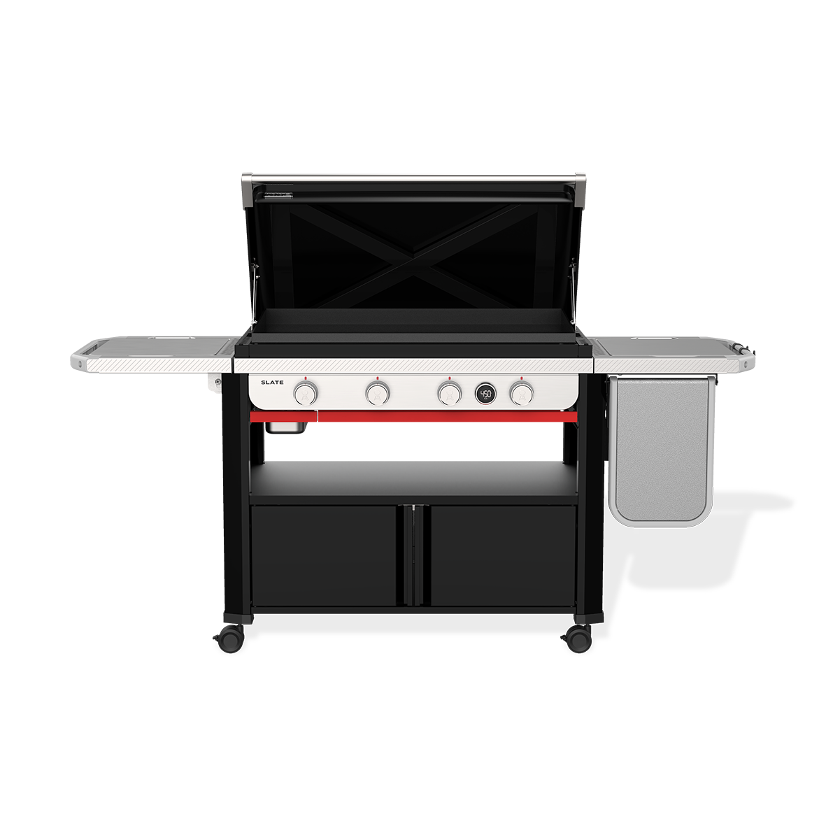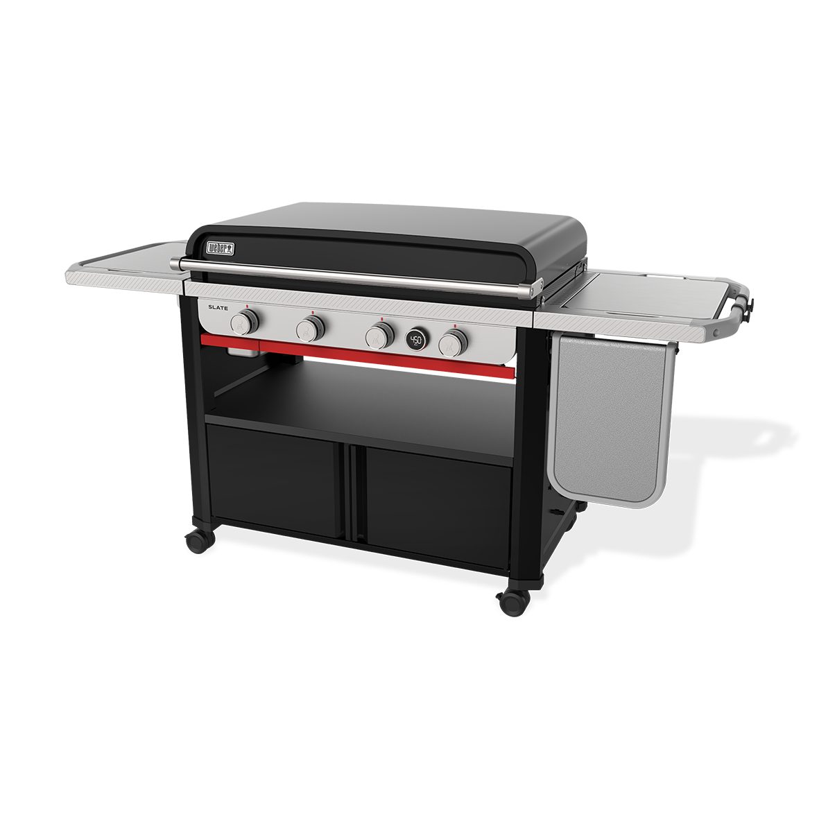 Have more fun griddling on the 36” (91 cm) rust-resistant Weber® Slate™ 4 Burner Premium Griddle BBQ that’s ready to cook on right out of the box. It reaches over 260°C and heats evenly edge-to-edge, so your food cooks consistently no matter where you place it on the griddle. The average griddle surface temperature is shown on the Digital Read Out display. Plus, with the Weber Works™ Prep, Cook, and Store System you can keep cooking and cleaning supplies handy, carry food and condiments from the kitchen to the griddle, convert the side table into a prep station and stow gear in tightly sealed containers.