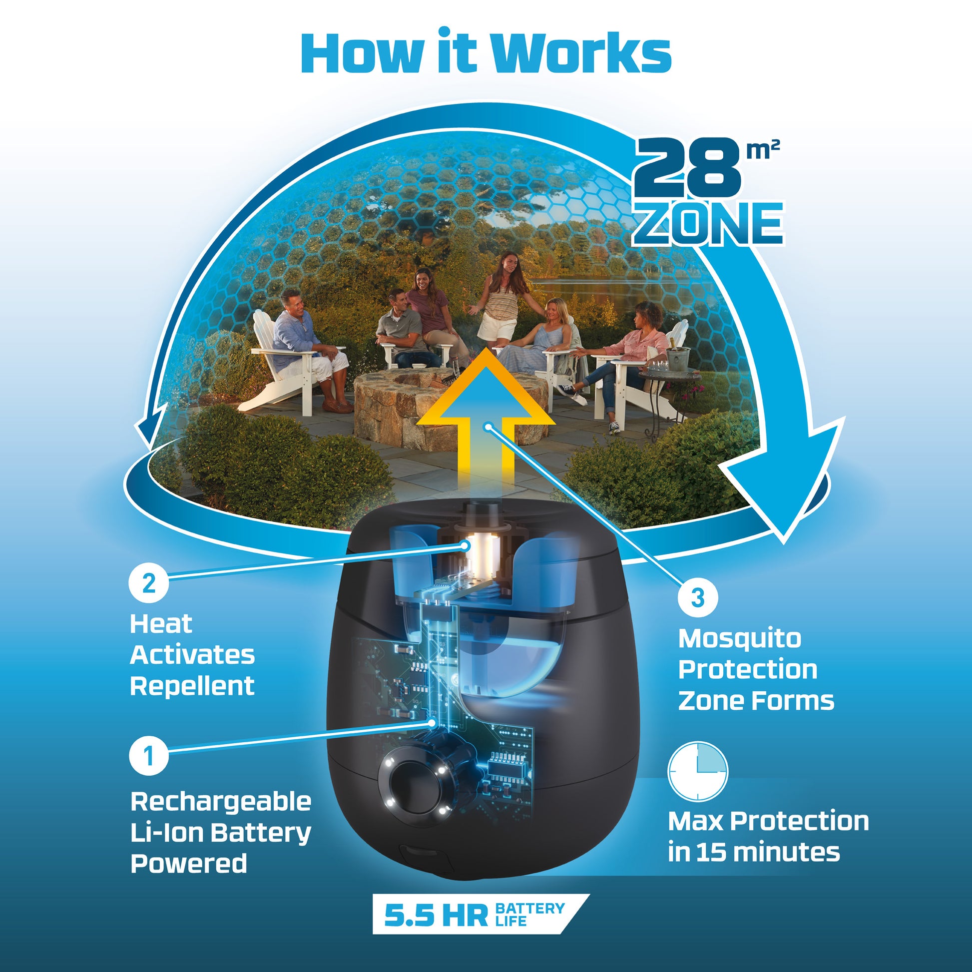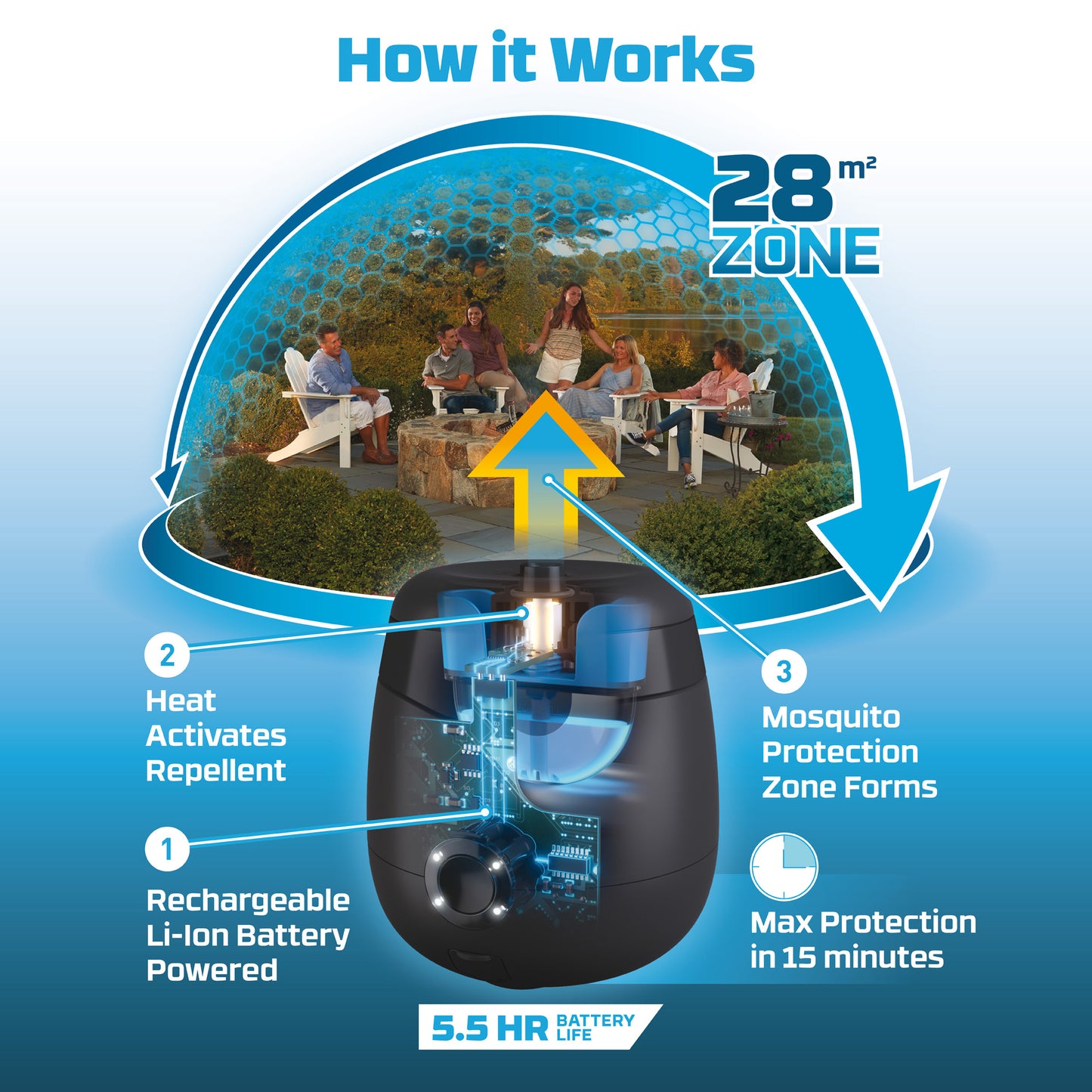 - Repel mosquitoes without DEET sprays or lotions on your skin. No smoke, flames, or strong scents.