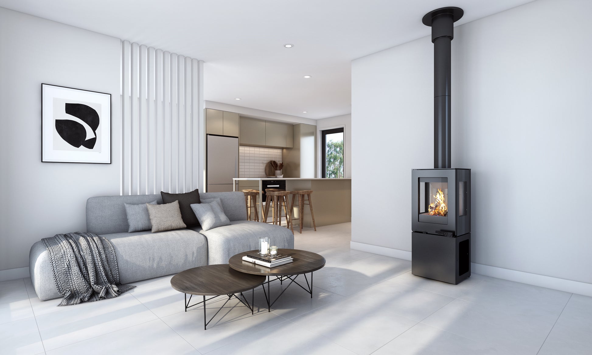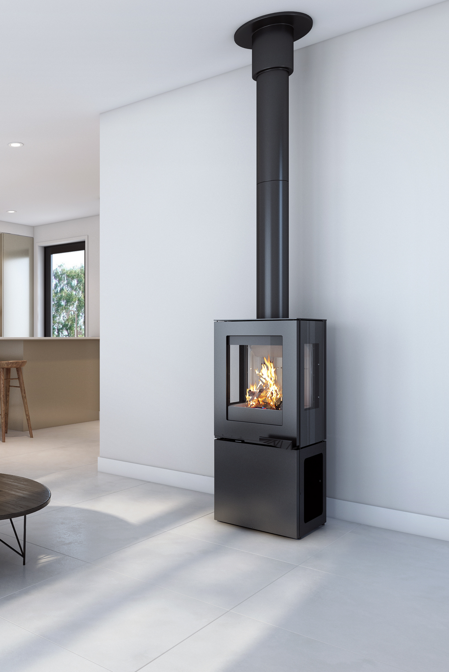 Its sleek self-closing door and beautifully designed storage compartment is partnered with a 3 sided glass viewing experience in a compact yet robust fireplace perfect for tiny homes or small to medium living spaces.